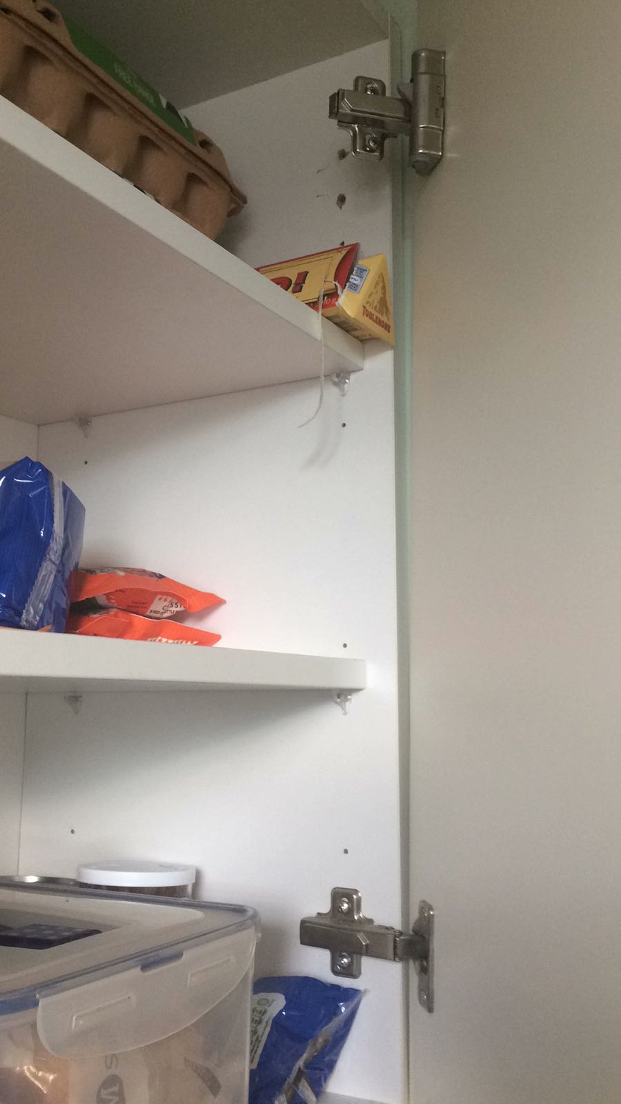 Which are the horizontal screws on the part of the hinges closest to the back of the cupboard.