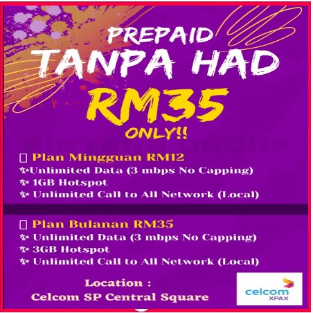 Dengar kata pihak celcom bahawa anda boleh dapat percuma 10gb utk 3 hari pertama. Existing xpax prepaid customers do not have to worry though, as the previous unlimited internet plans are still available to them, . Celcom has revealed two new unlimited internet passes under its xpax prepaid services. Consisting of weekly and monthly passes, . The new truly unlimited prepaid plan is available in a weekly pass at rm12, and a monthly pass at us$8.21 (rm35), which enables users unlimited .